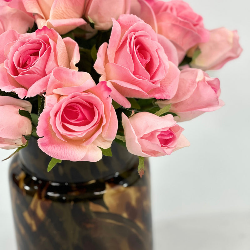 Pink Roses Arrangement in Tortoise Shell Glass Vase