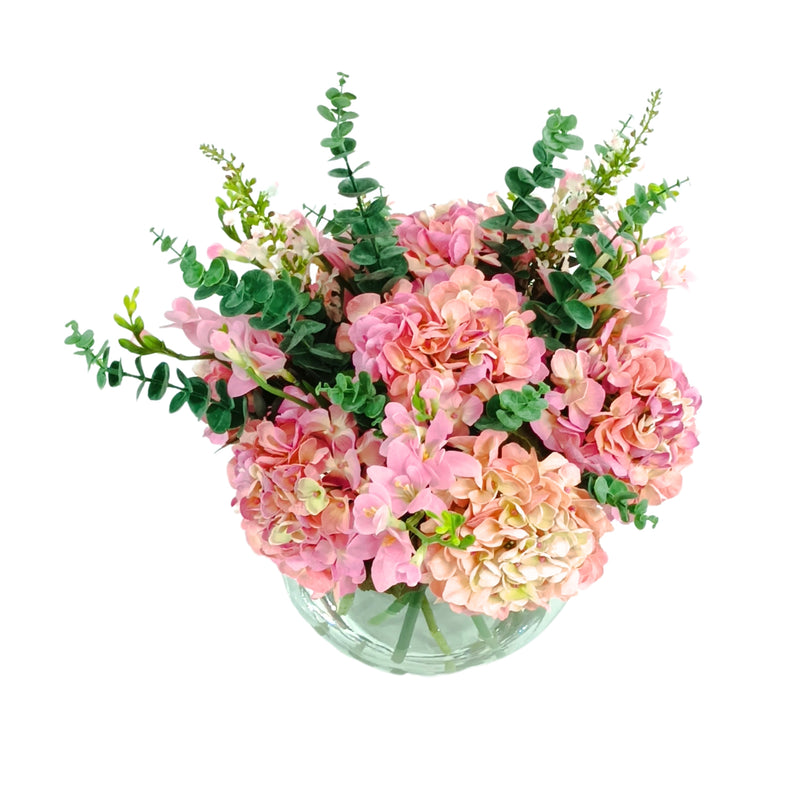 Hydrangea Purple Pink Arrangement in Small Fishbowl Glass Vase