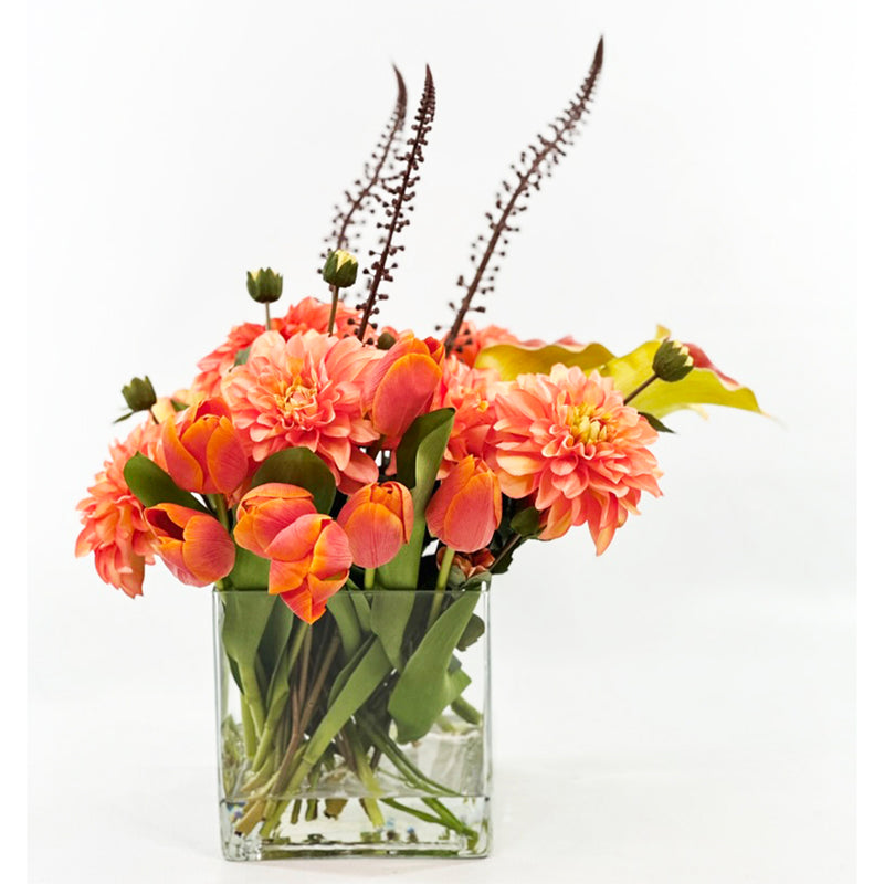 Mix Dahlia and Freezia Silk Flower Arrangement in Orange Glass Vase
