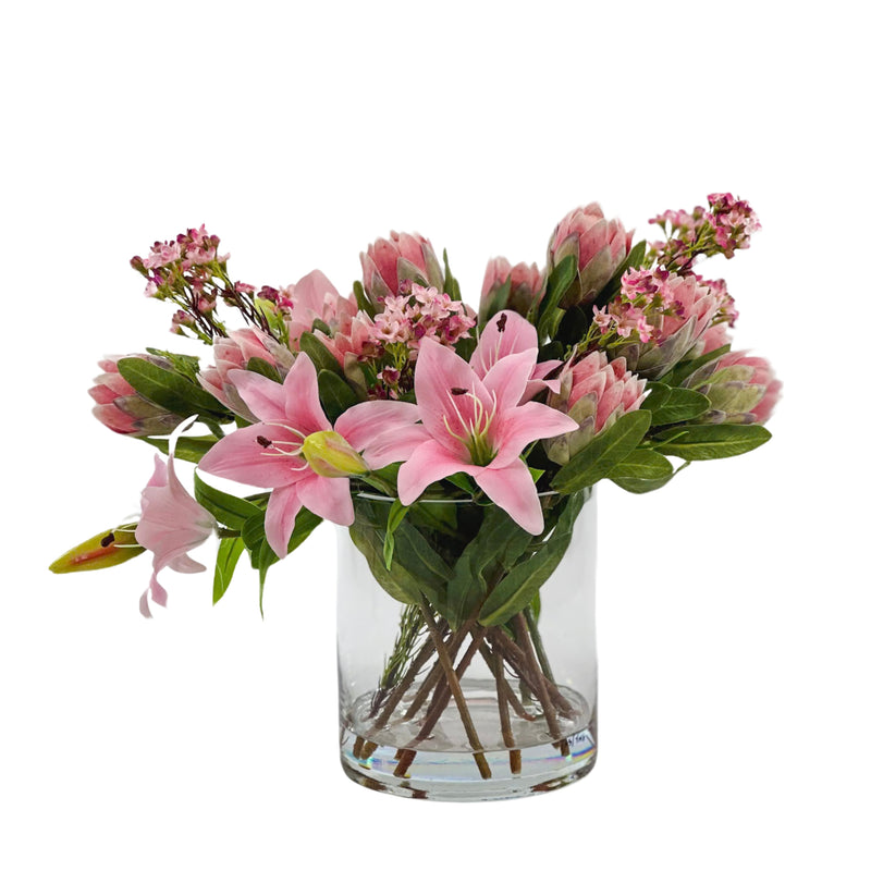 Lily Protea Mix Silk Flower Arrangement in Glass Cylinder Vase