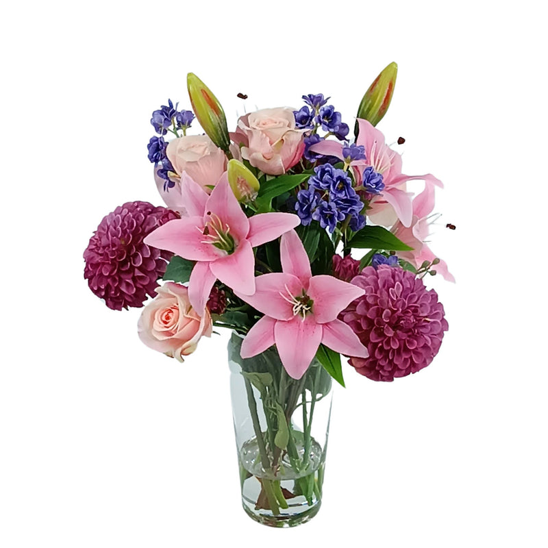 Mix Dahlia Rose Lily Arrangement in Tall Glass Vase