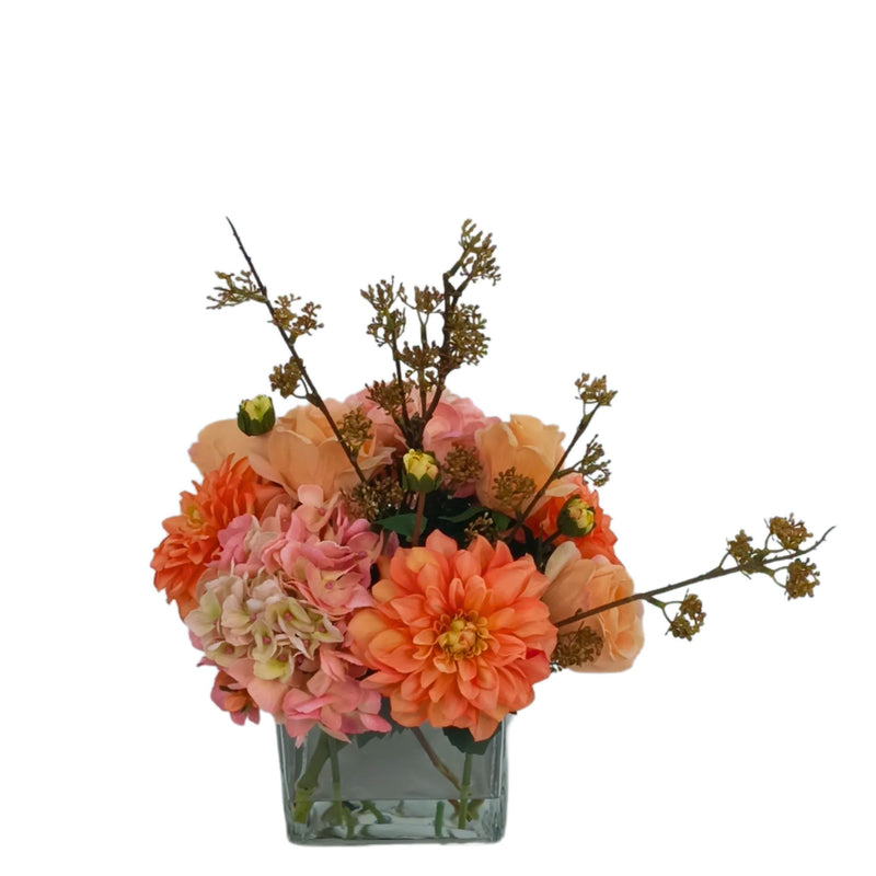 Mix Dahlia Rose Hydrangea Arrangement in Square Glass Vase
