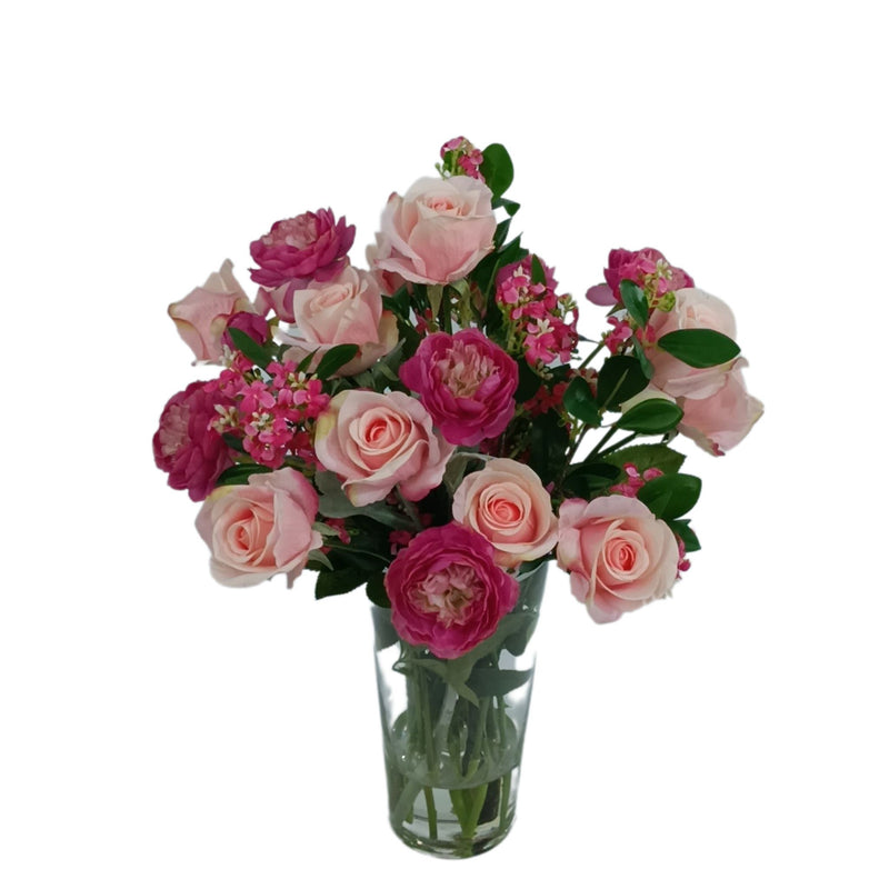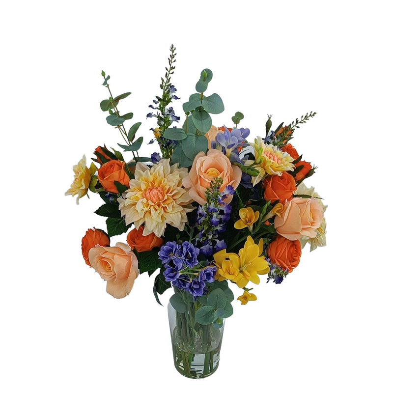Mix Freezia Dahlia Roses in Tapered Glass Vase
