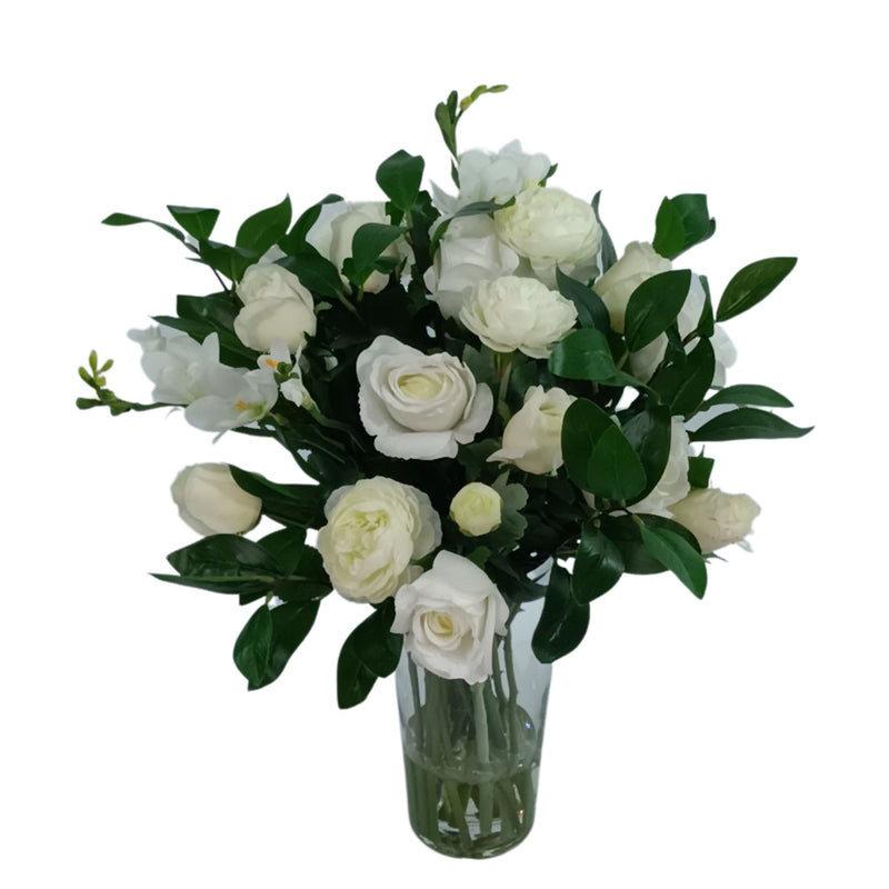 Mix Rose Rananculous Freezia Arrangement in Tapered Glass Vase