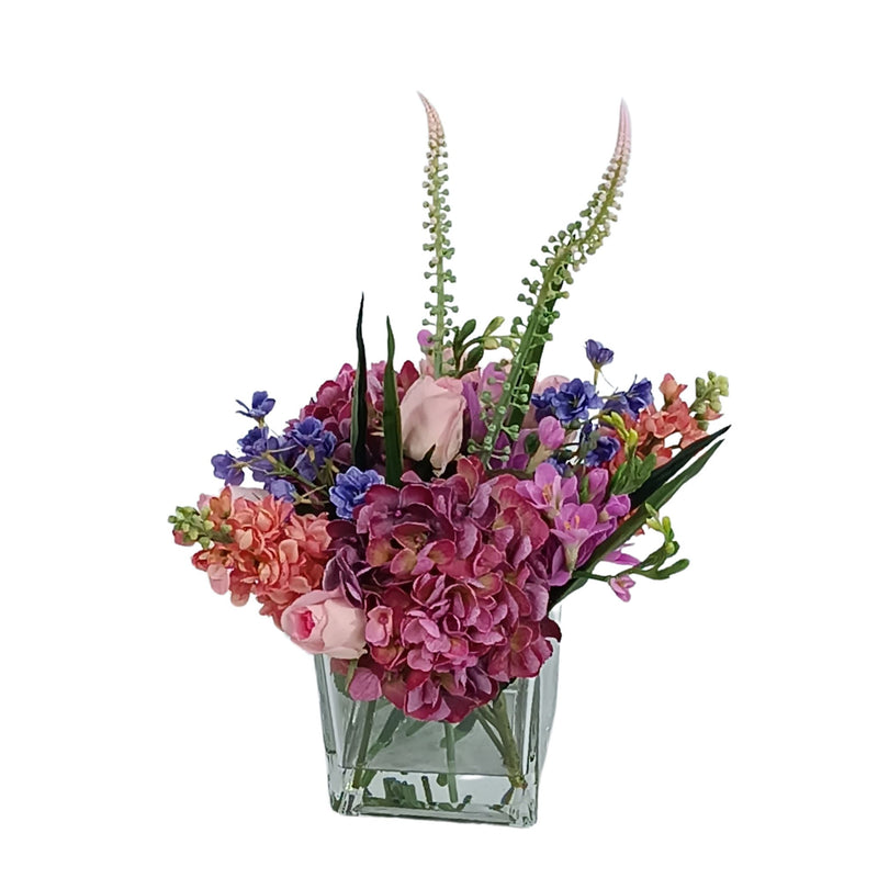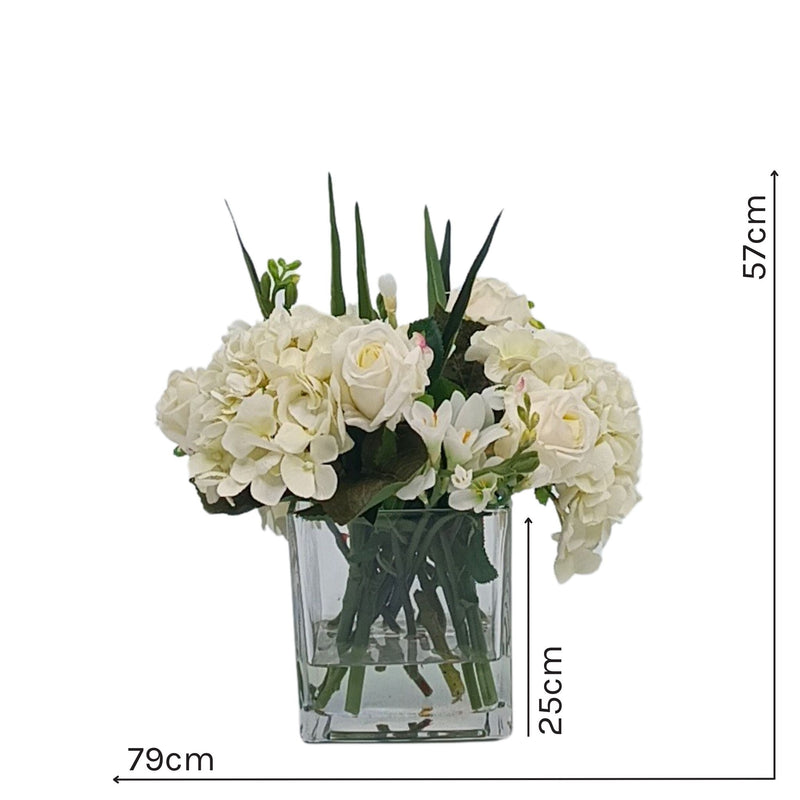 Mix Hydrangea Rose Freezia Arrangement in Square Glass Vase