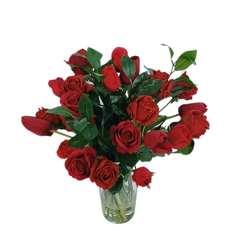 Mix Tulip Roses Foliage Arrangement in Cone Glass Vase