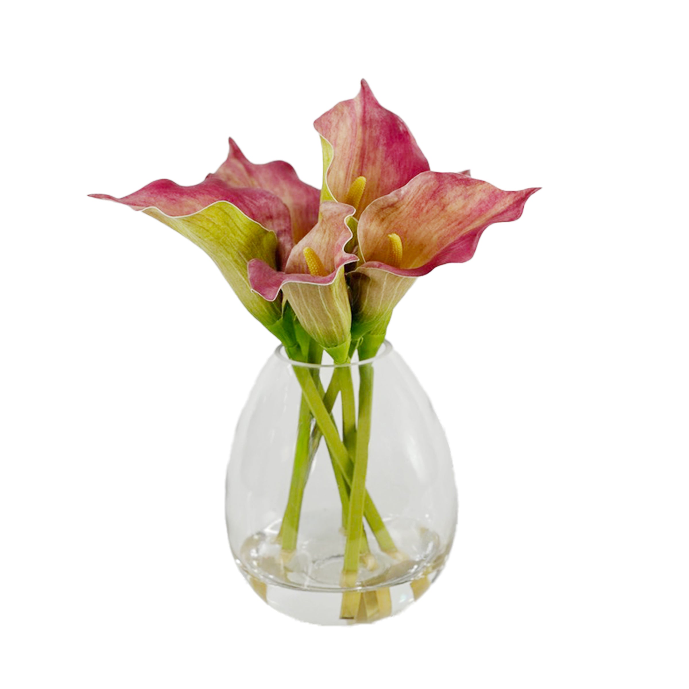 Add a beauty of fresh spring day indoors with our pink green arum lily arrangement. Standing at an elegant 36cm, this silk flower arrangement features beautifully crafted pink green arum lily blooms presented in realistic faux water in a refined glass vase.